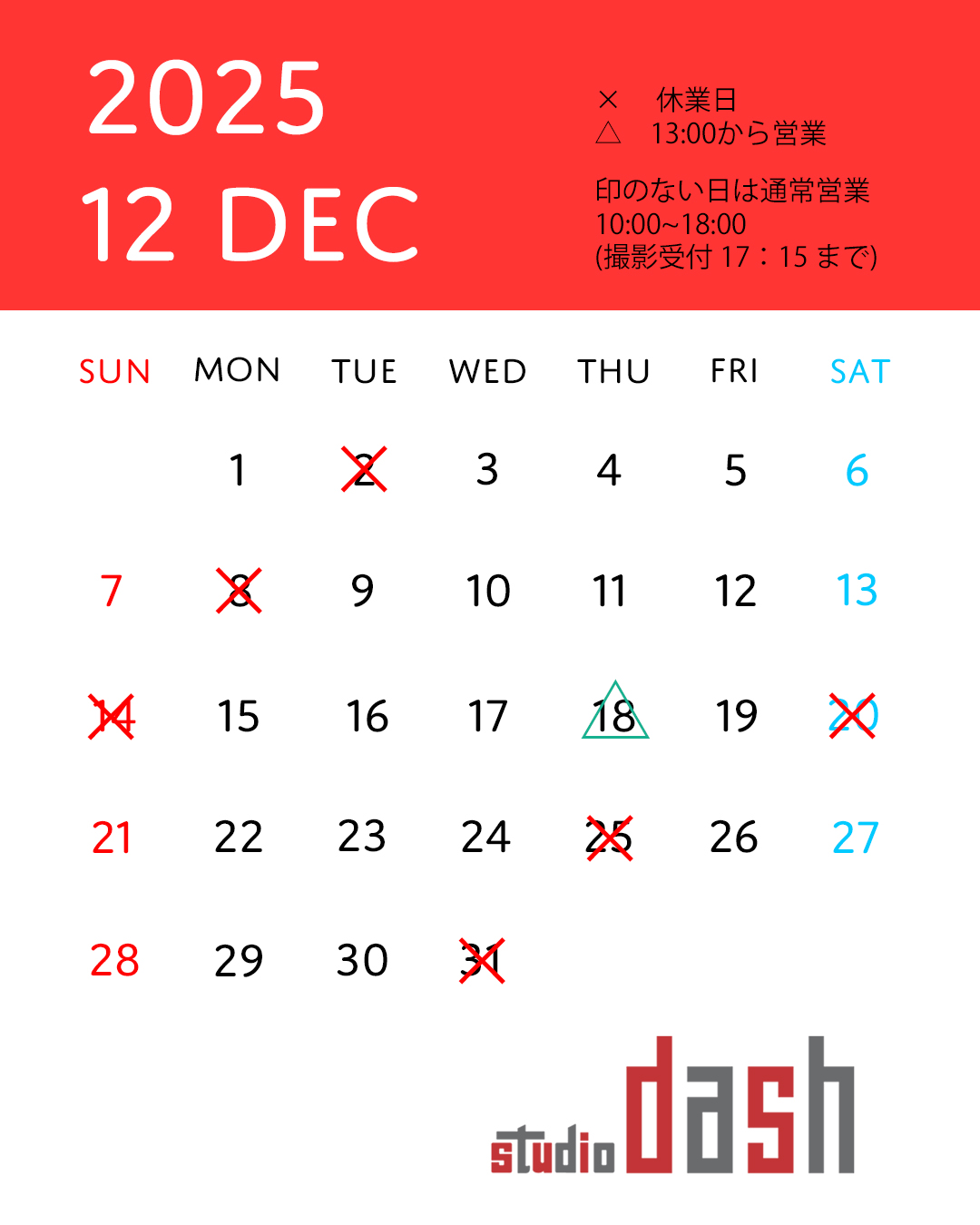 - 2025/11/28 : 12月店休日のお知らせ 札幌 狸小路6丁目 スタジオダッシュ