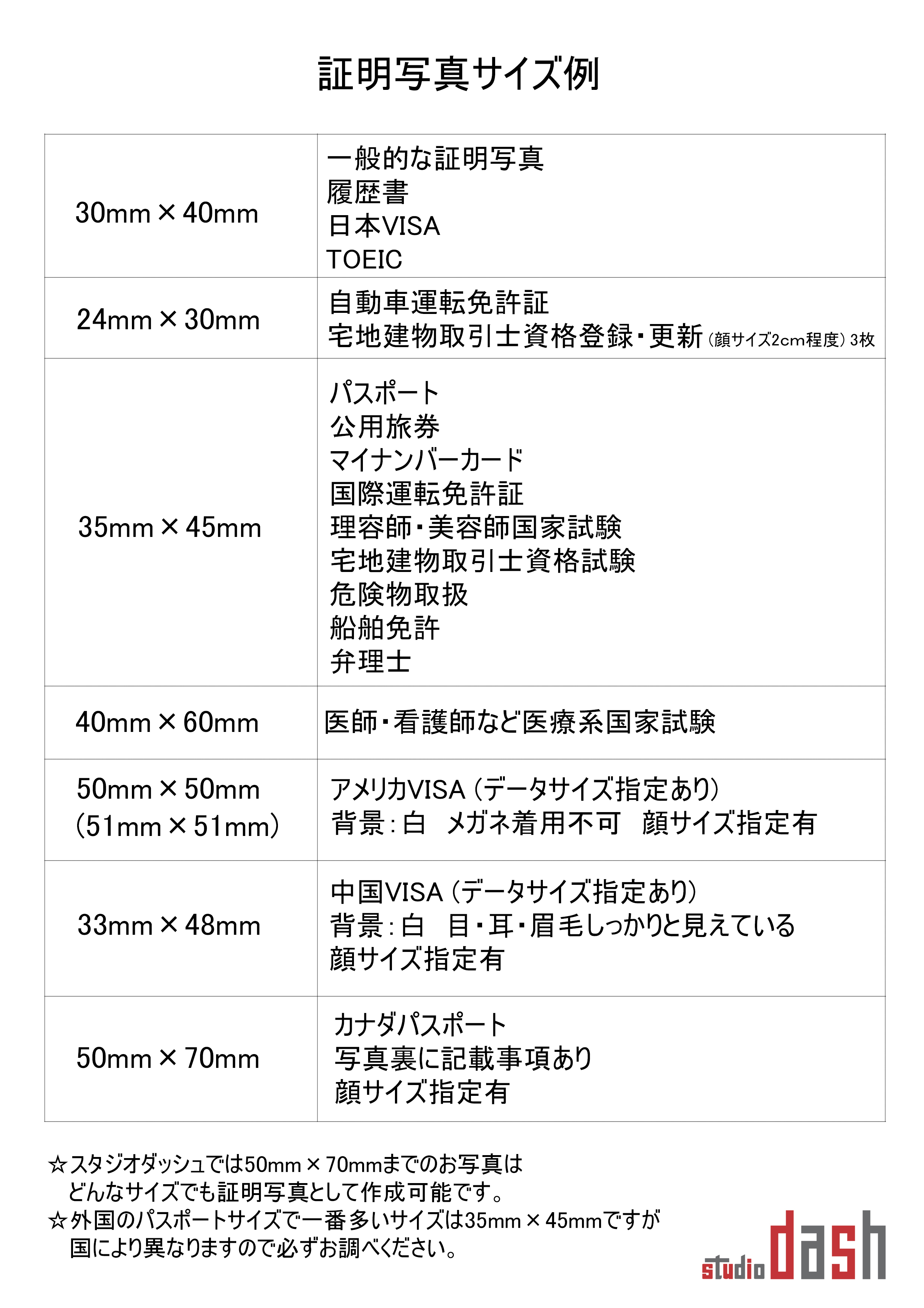 各種証明写真サイズ 札幌狸小路6丁目 スタジオダッシュ